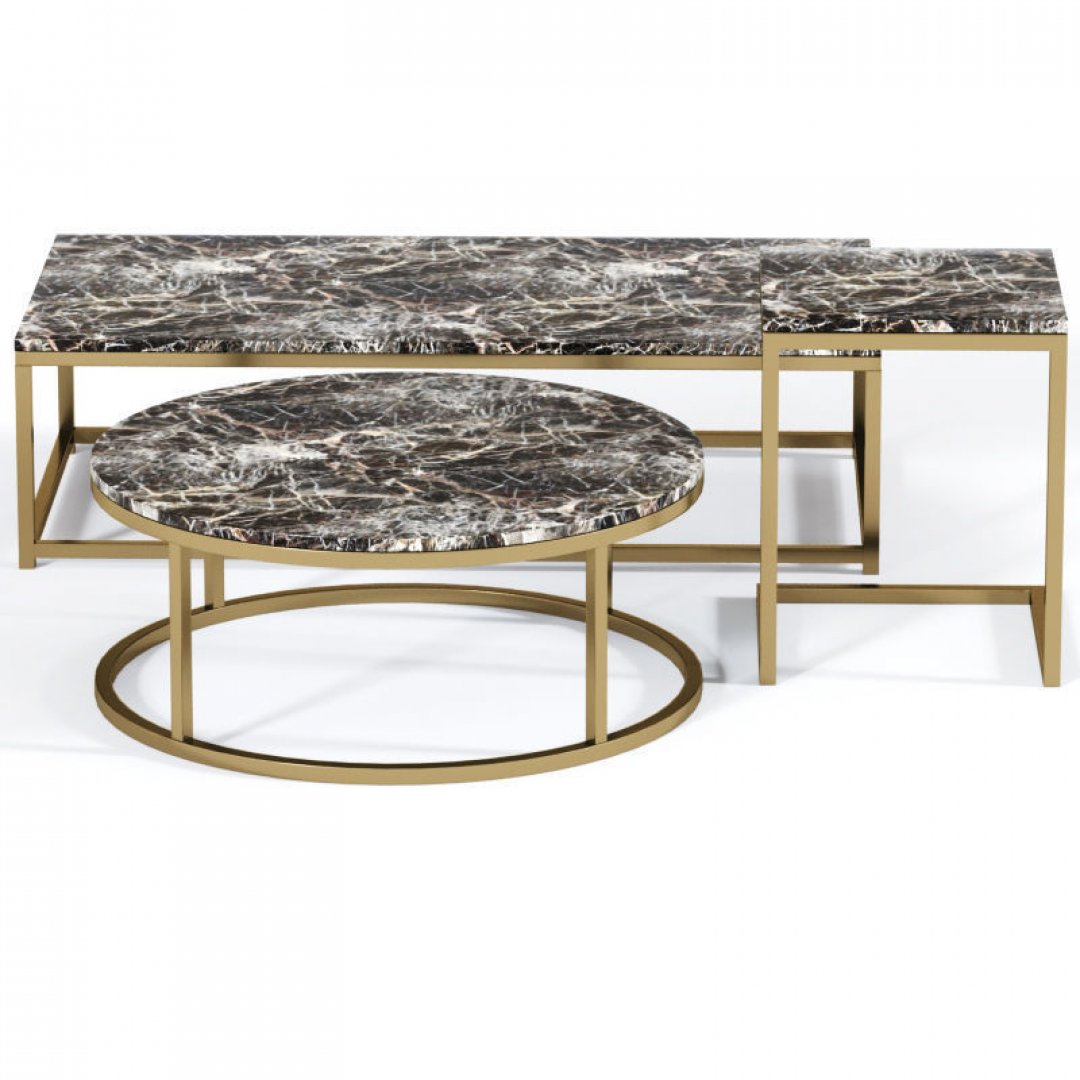 Zarif çizgileri, göz alıcı granit yüzeyi ve modern metal ayak tasarımıyla öne çıkan bu sehpa seti, yaşam alanlarınıza sofistike bir dokunuş katıyor. Dikdörtgen ve yuvarlak formun uyumunu bir araya getiren tasarım, hem estetik hem de fonksiyonel kullanım imkânı sunuyor. Kahverengi zemin üzerindeki doğal damar detayları, mekâna derinlik ve lüks bir hava katarken; altın tonlarındaki metal ayaklar güçlü ve modern bir duruş sergiliyor.